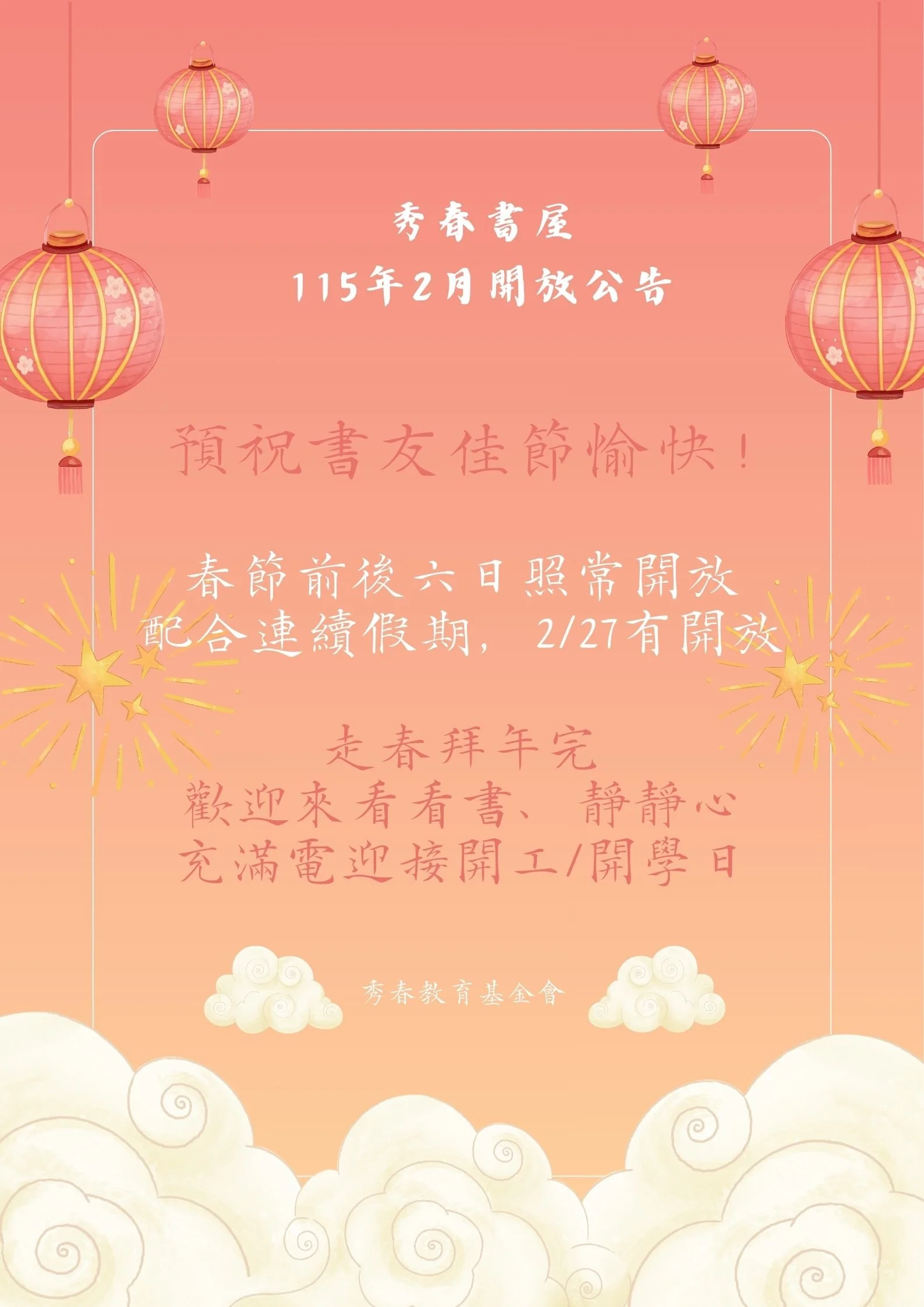 2020年2月4日至25日,親愛的鄉親同學們,因應政府防疫,學校寒假延至2/25日,該期間秀春教育基金會之秀春書屋開放時間延長時間下午2:00至晚上21:00 。歡迎駕臨書屋一樓閱覽,二樓K書。共渡時疫病艱難時期!