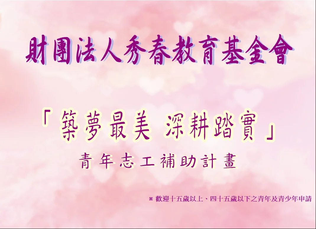 【秀春書屋】 【秀春講堂】升學課程 【磐石計畫】 【社會服務】 【吳岳講堂】線上看 勵學金頒發108.10.26 【築夢最美,深耕踏實】111年起停止辦理 【秀春急難救助】108年起停止辦理 【第一屆 秀春教育基金會熱血導師獎】 【第一屆 秀春教育基金會文學推手獎】